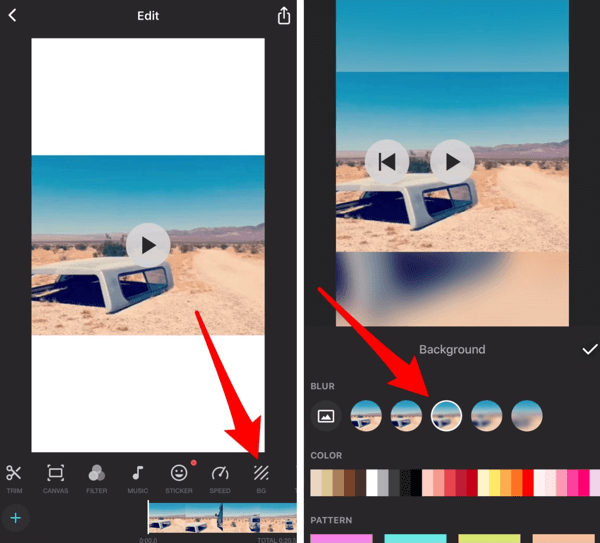 To edit the blurred margins, tap BG (background). The app lets you edit the intensity of the blur, switch to a pattern or solid color, or even import one of your own photosinto the background. Tap the checkmark when you’re finished.